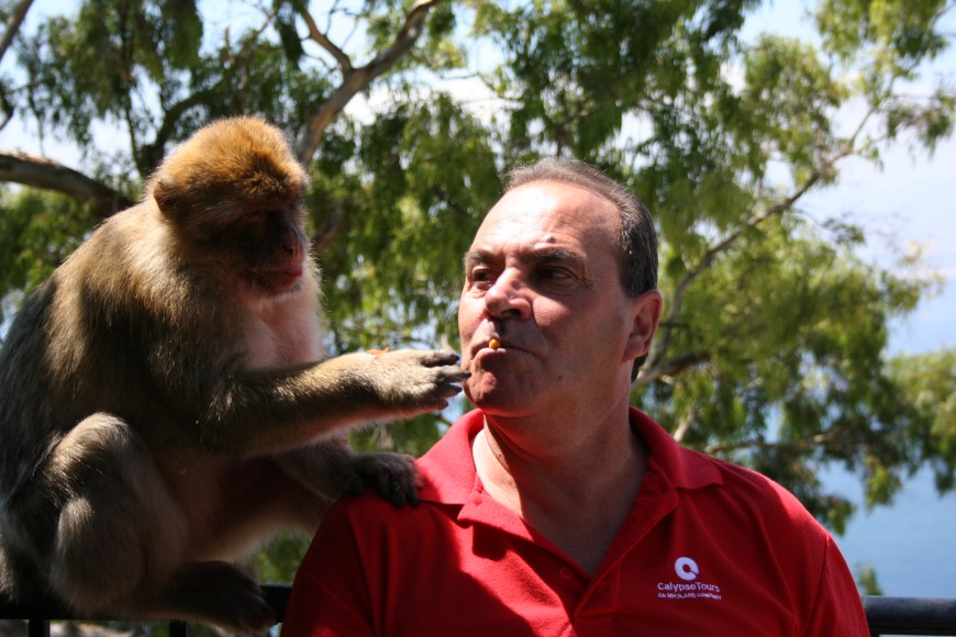 One of the great things about having a driver is the fact that they come with treats to get the monkeys up close and personal for photo ops.  This was our very first driver, Charlie. He was awesome. A crusty old Gibraltarian he had no problems sharing with the monkeys: