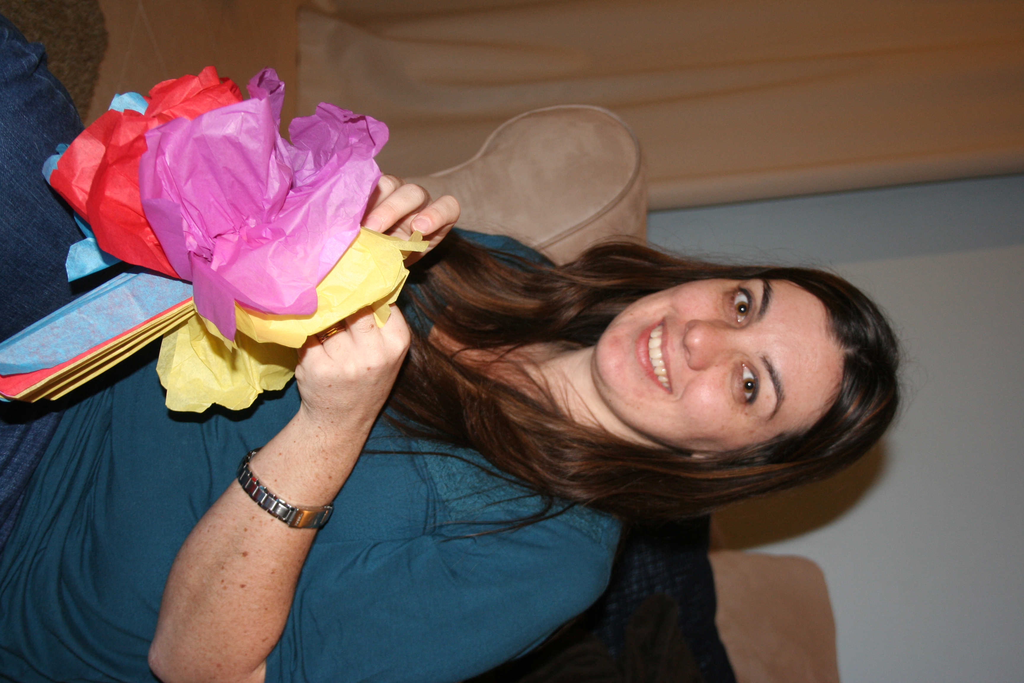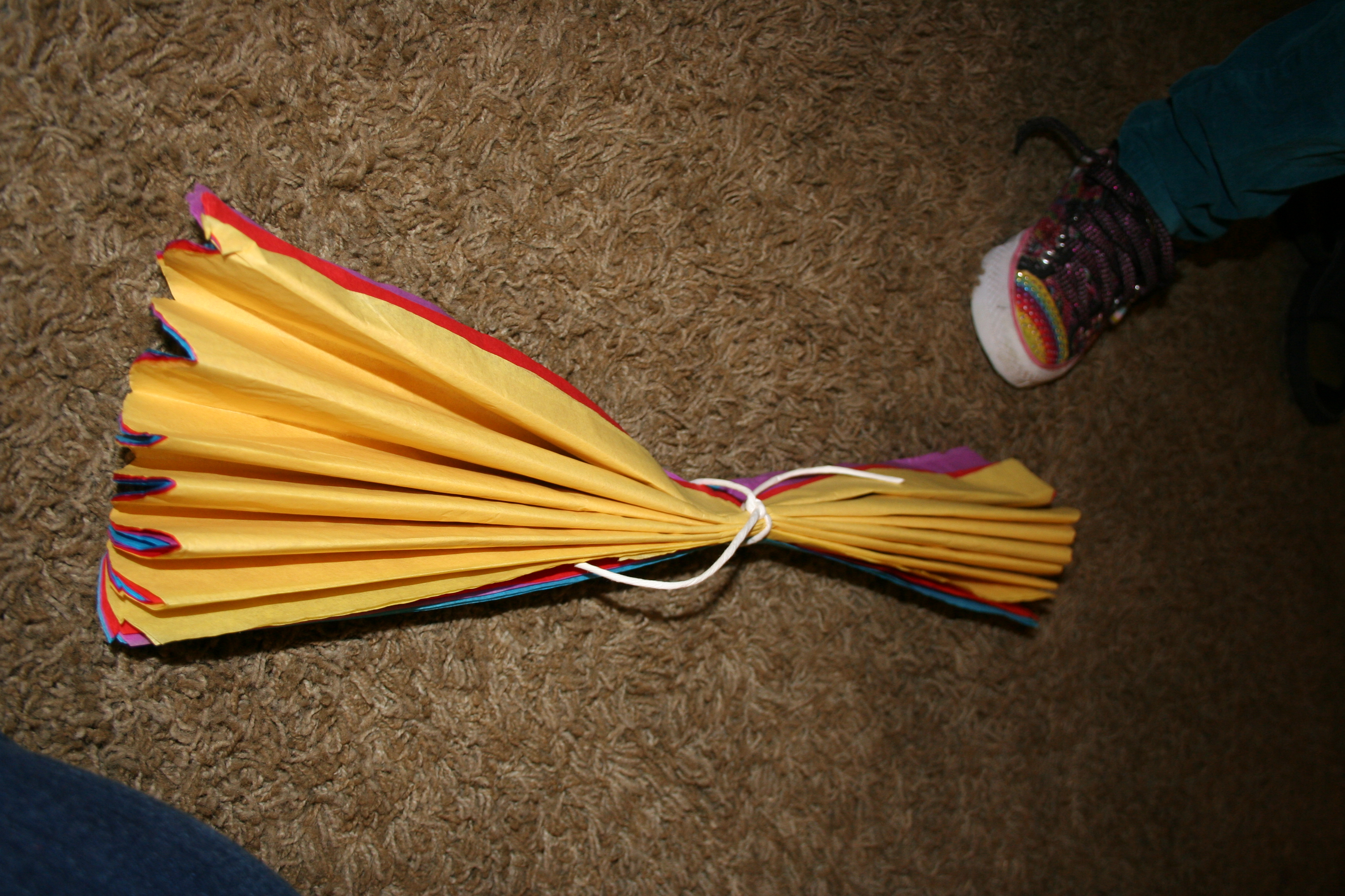 Fold them up like a fan (accordian fold, whatever)  Then tie the center.  Wire was recommended but I didn’t have any. I did have some of those paper ties that are used in kids toys to attach them to the cardboard so I used those. Then round the ends using some scissors.