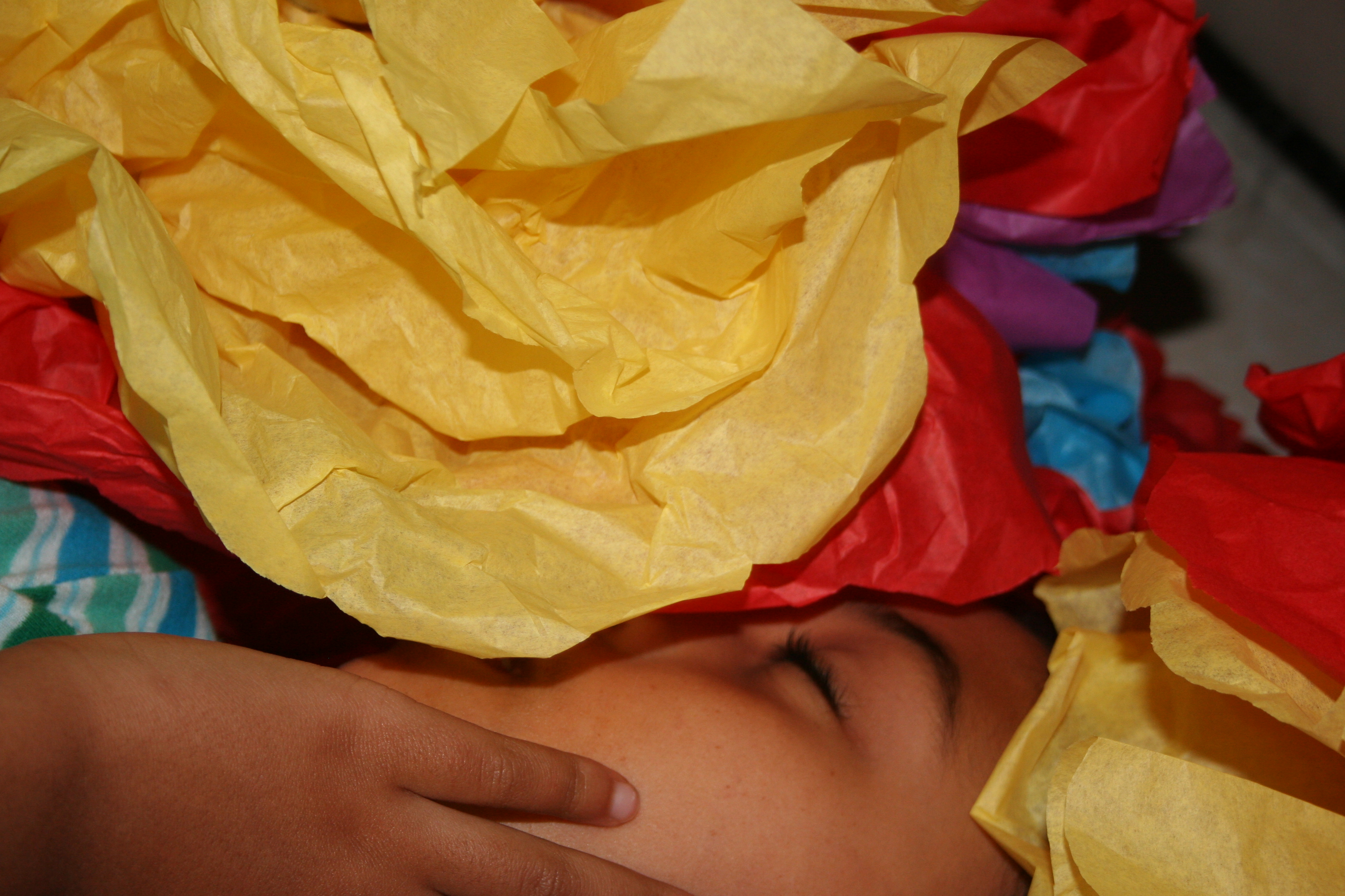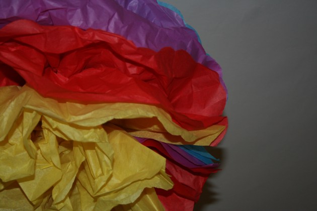 Open up your tissue paper and lay them in piles of 8-10 pieces.  You can use single colors, rainbow or any combination of colors to match a party theme.