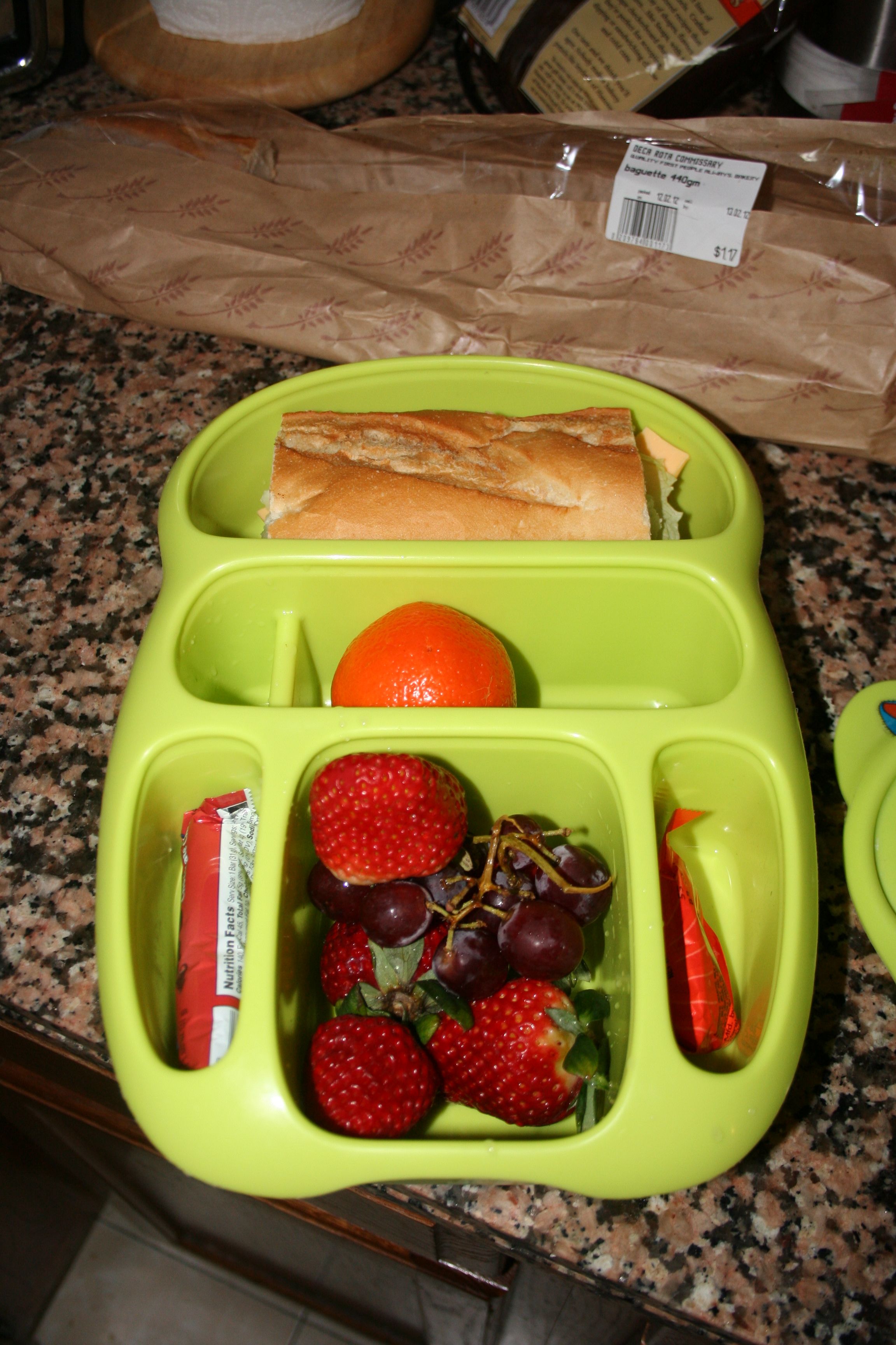I love this lunchbox so very much. It has 5 different compartments separated from each other and there is no need to have anything packed in plastic bags.