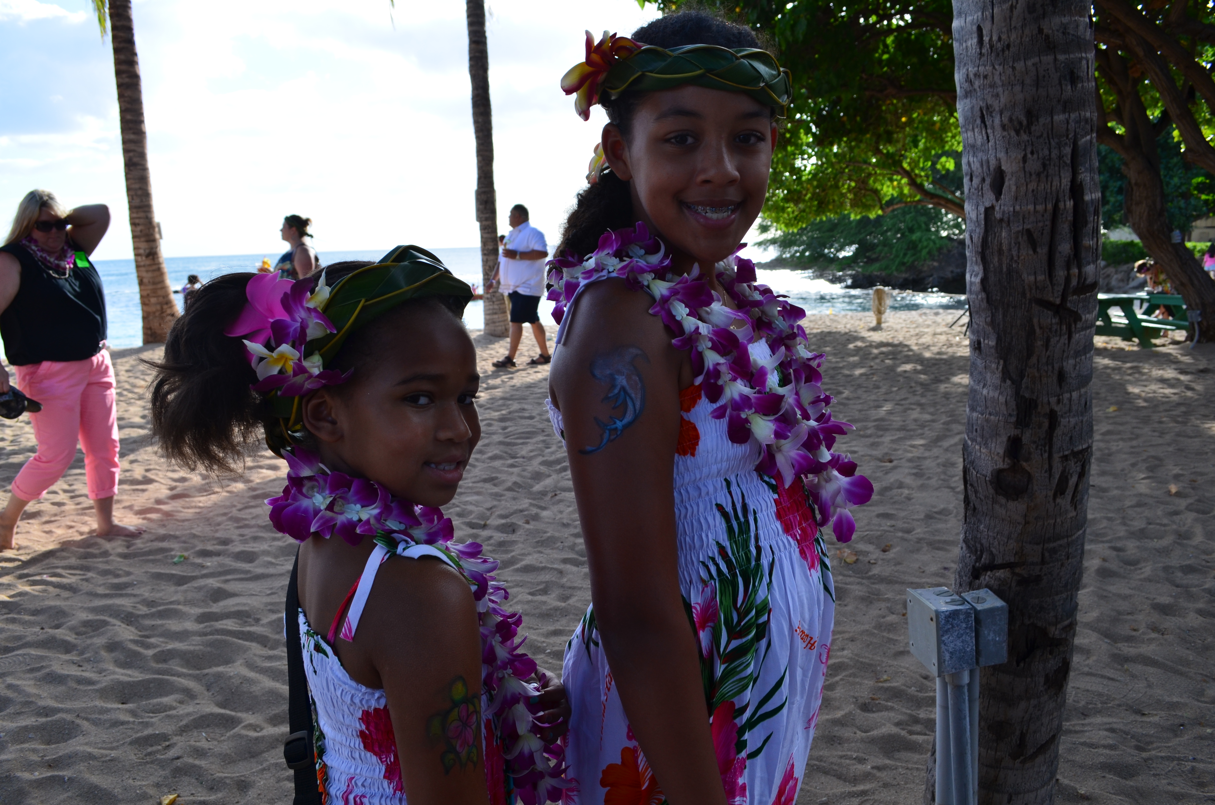 There are lots of activities to keep you busy until dinner starts so take your time and try to do them all if you can. Here Mckenna and Leah are showing off their tattoos and haku leis.