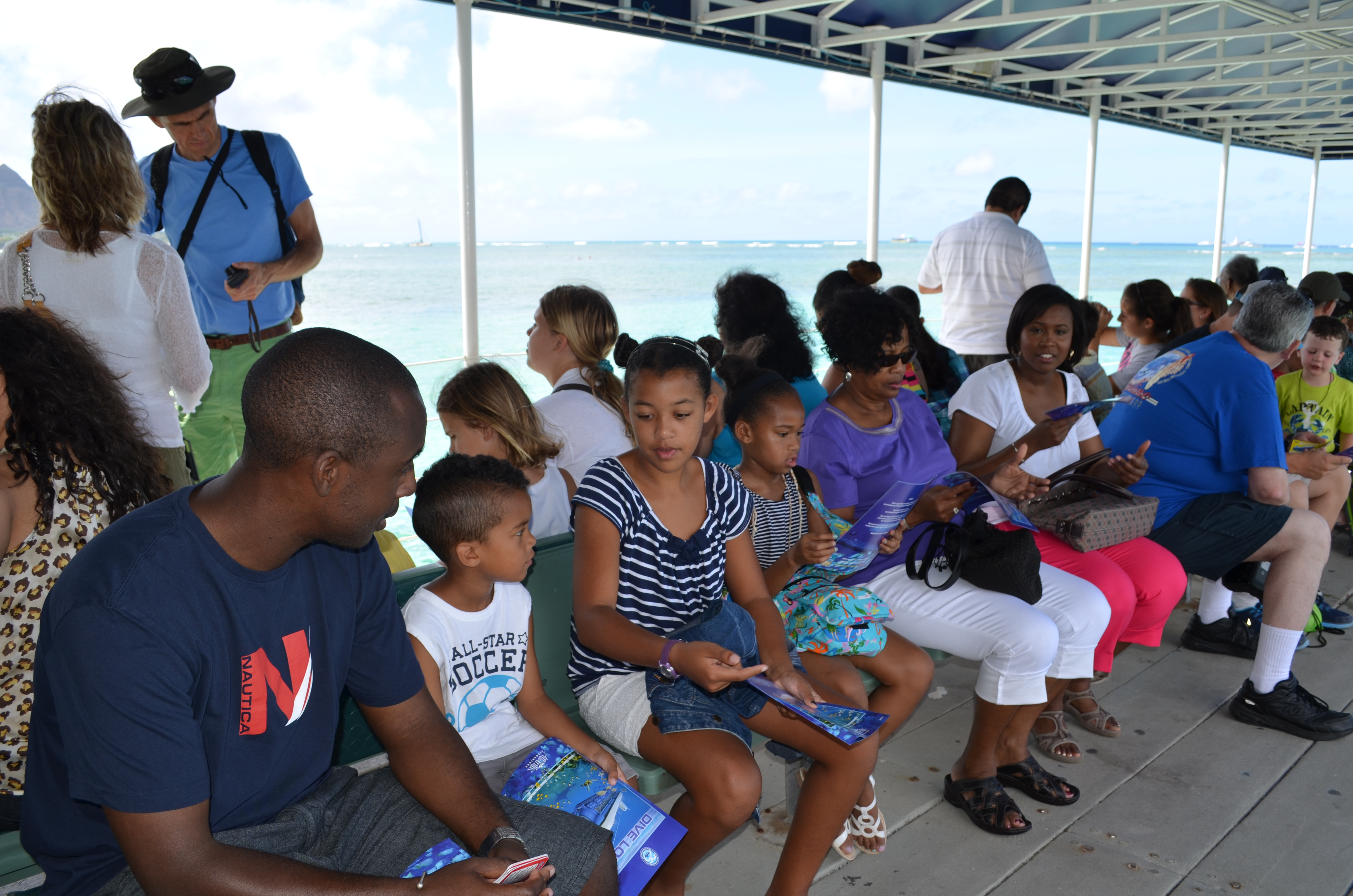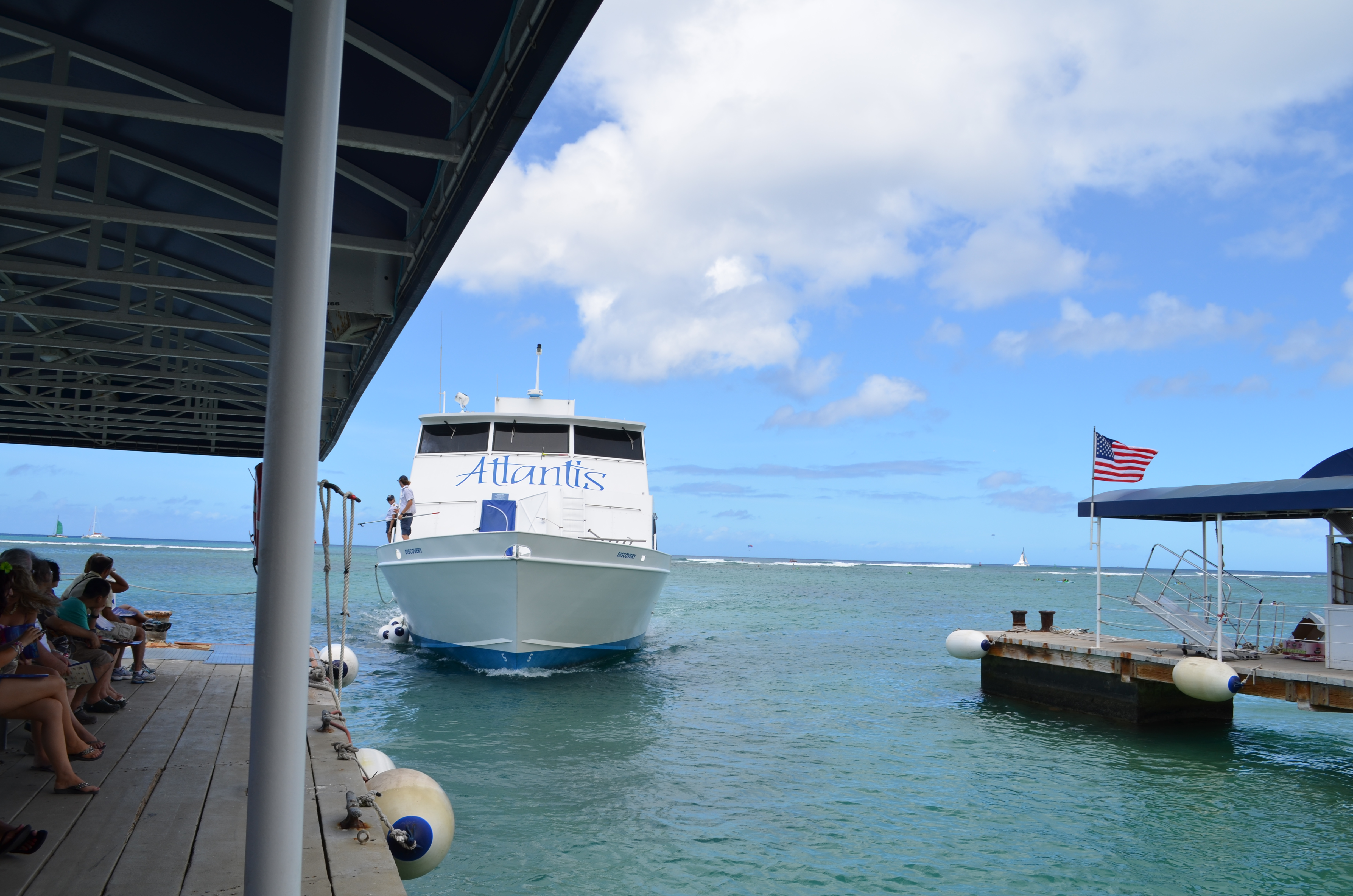 Continuing the touristy recap of my in-laws visiting… We did the Atlantis Submarine tour. I have to give my husband credit, he found this one. I was worried that it would be kinda lame since we do quite a bit of snorkeling so we are used to seeing reef fish. I was pleasantly surprised at how many fish we saw and it was just plain cool being in a submarine. Again ITT tickets were almost half price. The check-in for the sub is on the beach side of the Hawaiian Hilton, you then walk out on the pier there to wait for the tender.