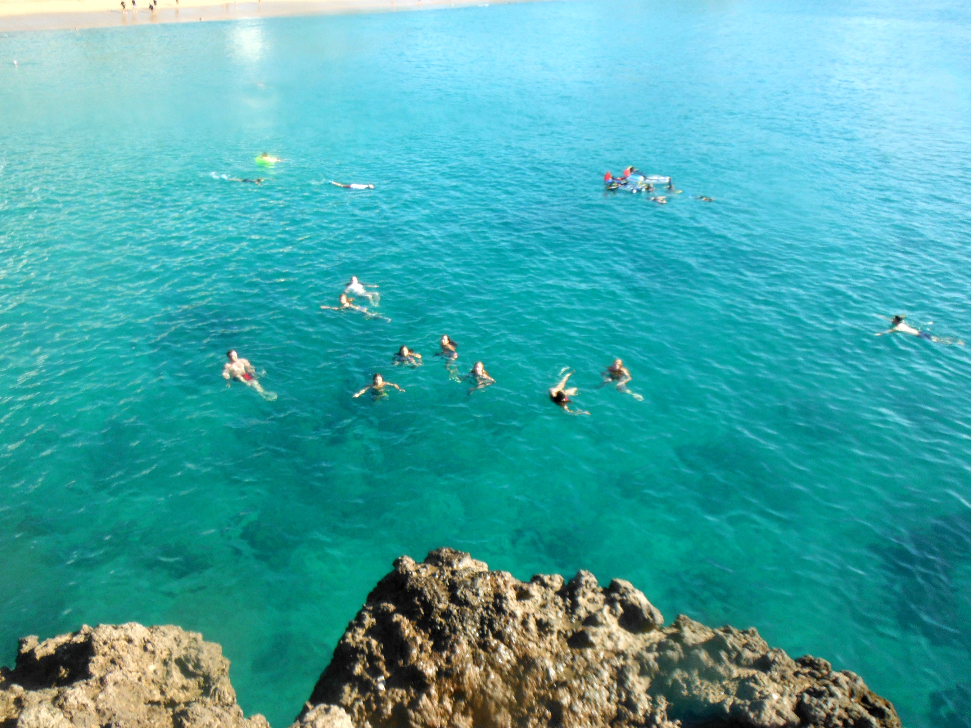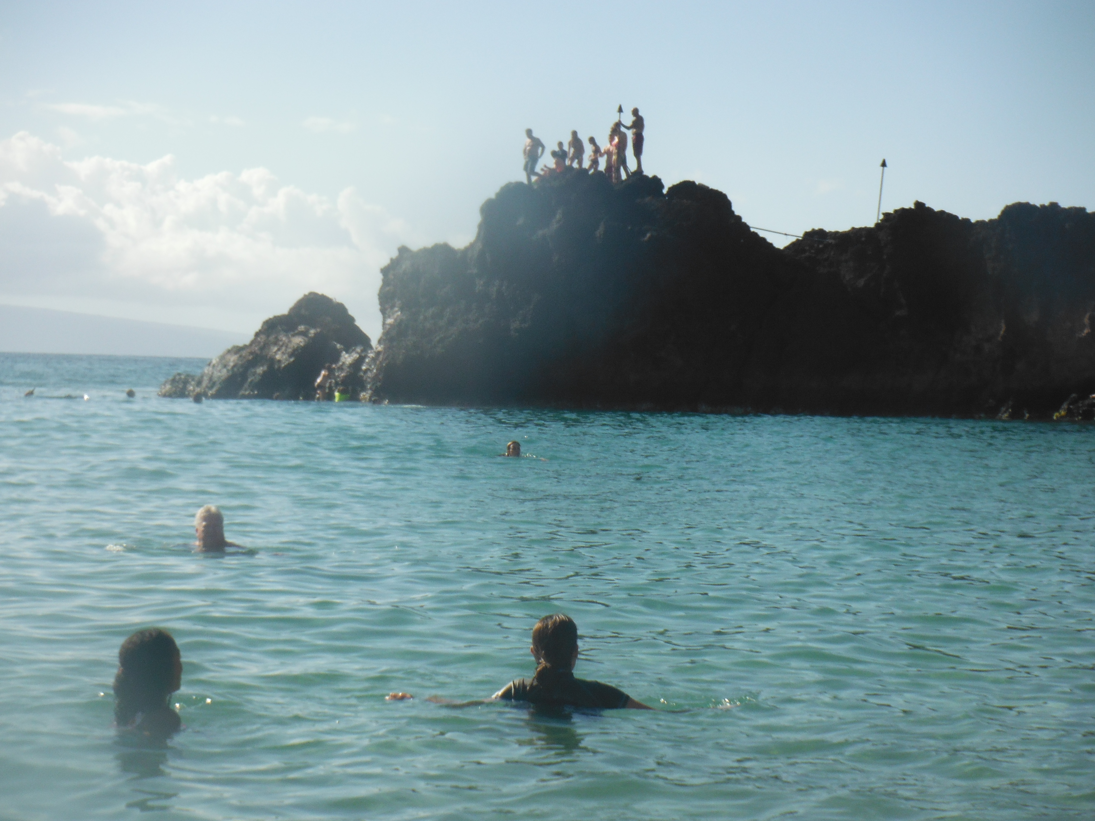 Me getting ready to swim out to the rock. You can see toward the left there are people crawling out of the water onto the rocks. That is the slippery, tricky way up to the top. (Also it’s all lava rock and is sharp as hell…)