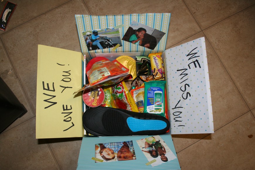 The next box I sent was my favorite and I forgot to take a dang picture of it! I am so mad at myself! I had it all decked out with a Navy theme, that one had the PS Vita he wanted as well as his iPad cover/stand he forgot to take. You’ll just have to picture it in your mind. It’s terrible but it was a good use for the Navy embellishments that I didn’t like and wasn’t going to use for actual scrapbooking but didn’t want to throw away. So don’t throw away your ugly stuff! Just use it on your husband, he doesn’t know the difference!