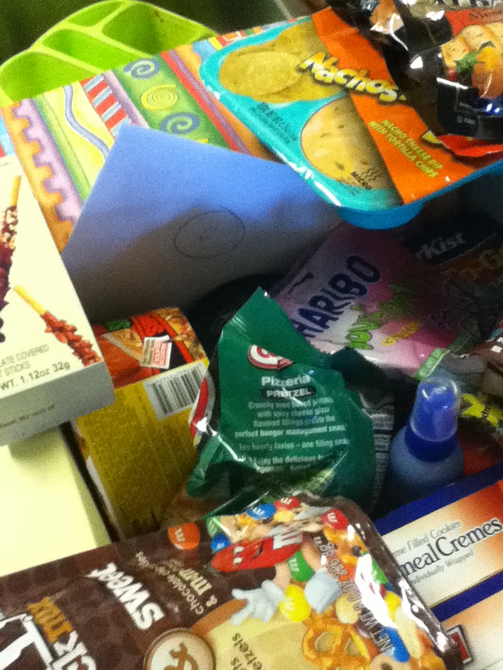 And here is the latest box, just sent this one this weekend and I am a little mad at myself, didn’t realize how late it got in the month! I want this to get there before Halloween but it probably won’t. This is my first ‘theme’ box. I didn’t want to just sent a crap load of candy so I sent some other snacks in there too… The little jack o’ lantern tin was in the dollar section of Target, I put some of those single piece candies you see, pumpkin shaped snickers, rotten egg cadbury, etc. Also Target had the crinkle paper filler in lime green so that is in the bottom of the box. Oh and I found a stupid creepy mask at the exchange for a dollar so I threw that in too…
