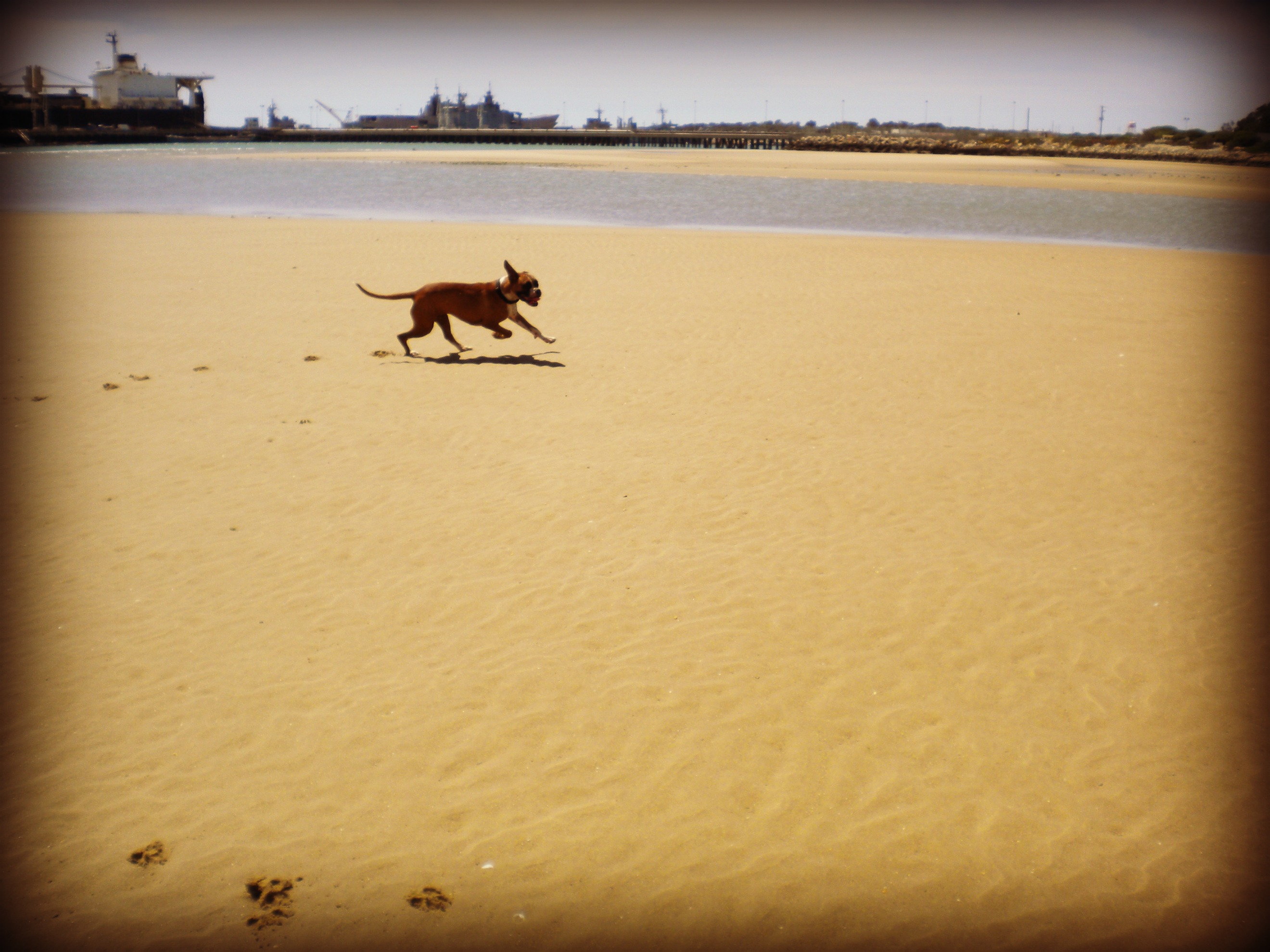 On Saturday a friend of mine and I took our boxers to the beach. This whole area is under water at high tide but at low tide there is a TON of room for them to run. Swimming isn’t allowed so it stays empty and we can let the dogs run and they don’t bother anyone.