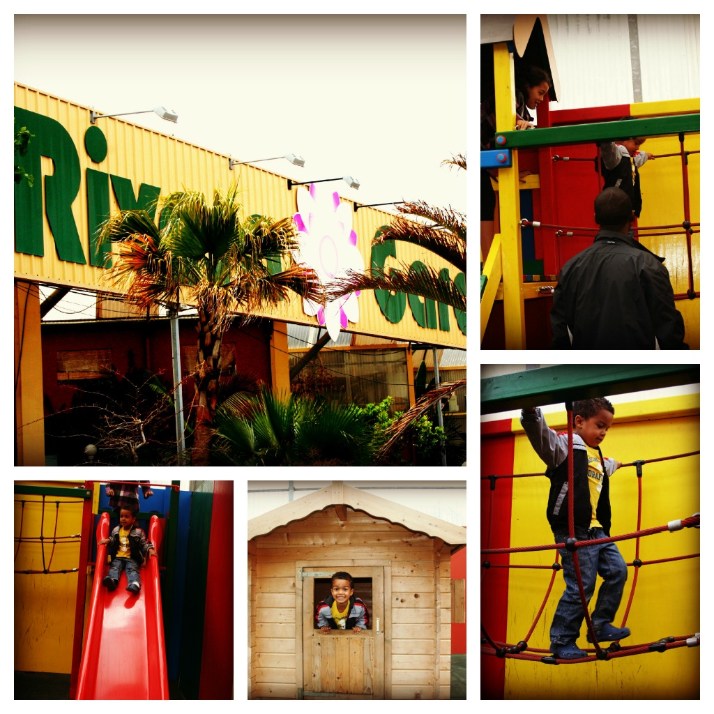 From the outside. The play area inside. Jungle gym & playhouse. There is also a small merry go round. And while your kids play you can enjoy a snack or coffee from the cafe inside. So nice.