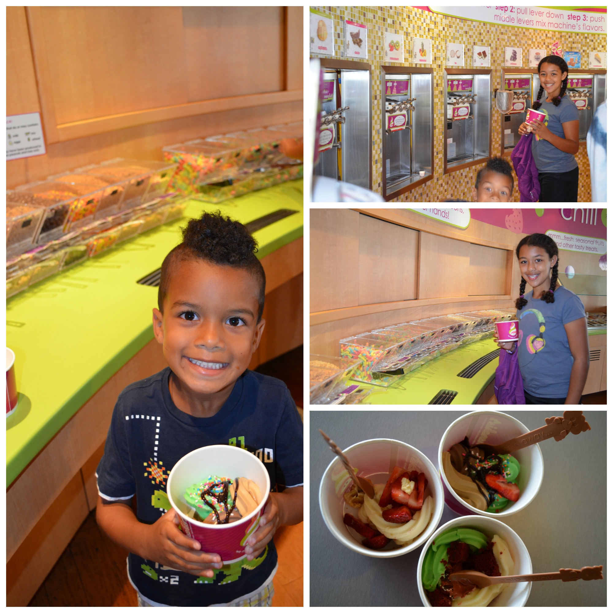 If you haven’t been to this type of FroYo shop before, you get to pick your flavors and topping and add whatever you want to your bowl. Then you pay by the ounce. Needless to say, keep a sharp eye on your kids so they don’t fill up the entire bowl! I went simple with cheesecake flavored frozen yogurt with fresh strawberries, while the kids had some interesting combinations. Mckenna got red velvet and mint with red velvet cake chunks, Omar got mint, ice cream sandwich and coffee with sprinkles.
